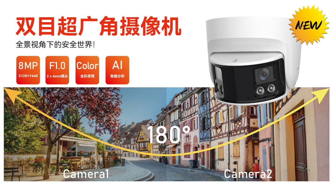 双目超广角收集摄像机接纳两个镜头拼接,拼接后的视角大于 175°,笼盖更广的地区,削减盲区,进步宁静性。另外,供给全彩高清图象结果。